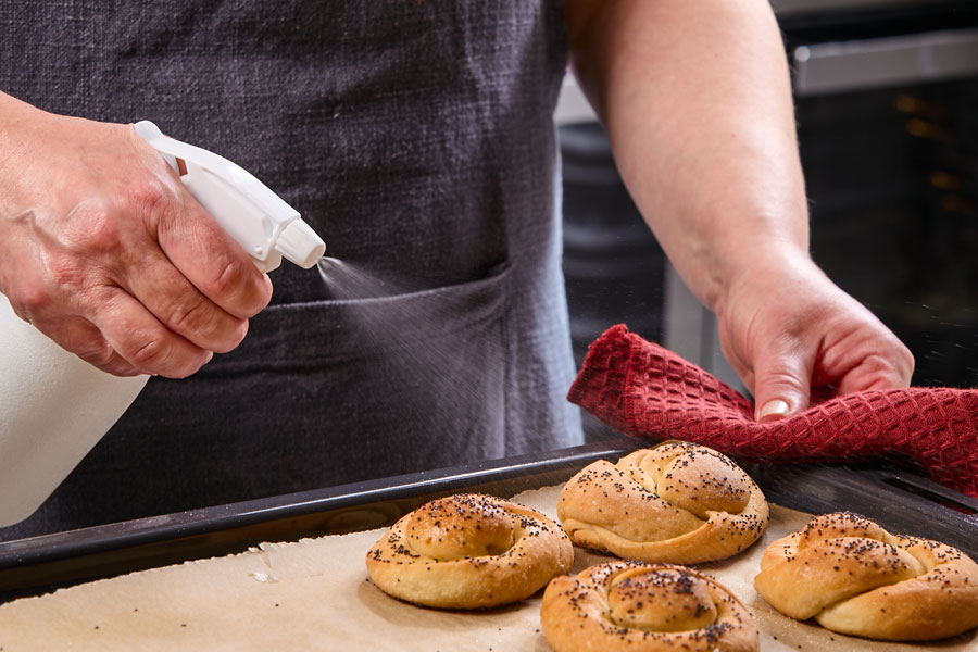 5. Pečte v předehřáté troubě na 170 °C asi 30–40 minut podle typu trouby. Ještě horké housky lehce postříkejte vodou a nechte zcela vychladnout.