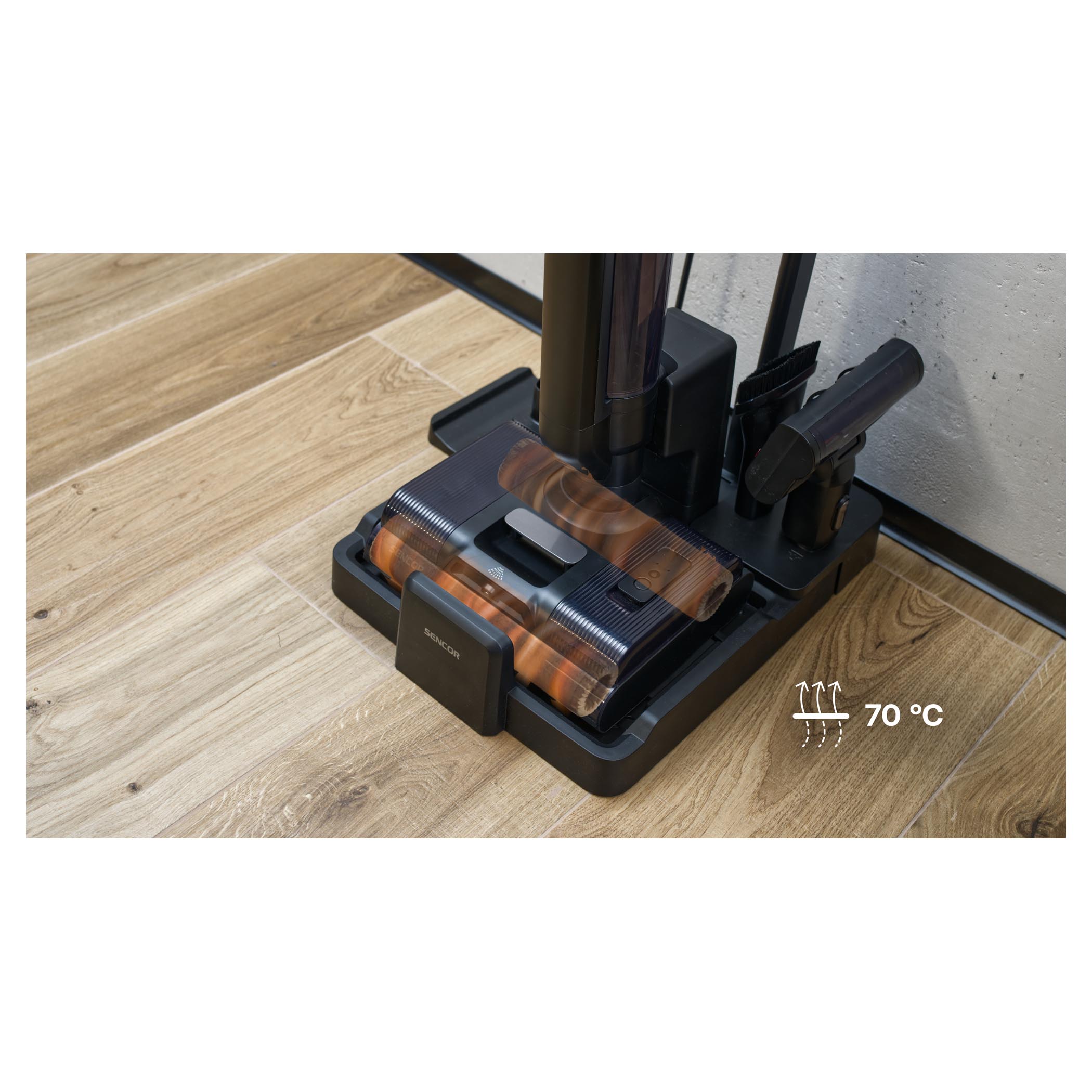 Sušení kartáče horkým vzduchem o teplotě 70 °C zabrání množení bakterií či zápachu z mokrých kartáčů.Úklid i pod nábytkem