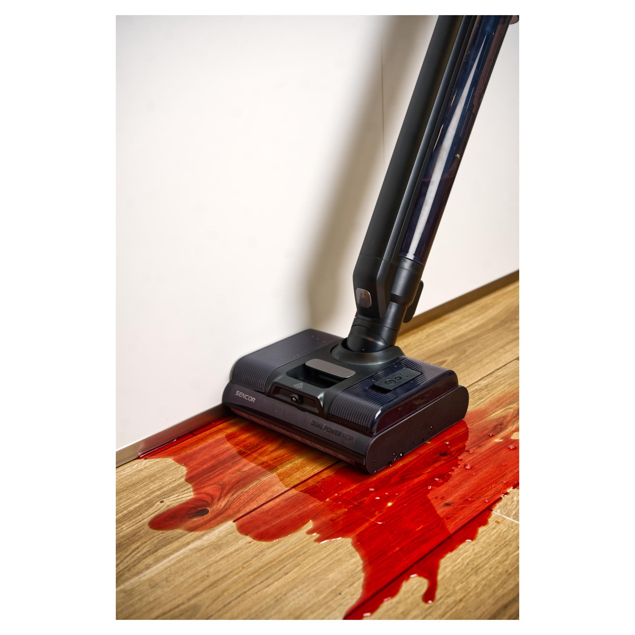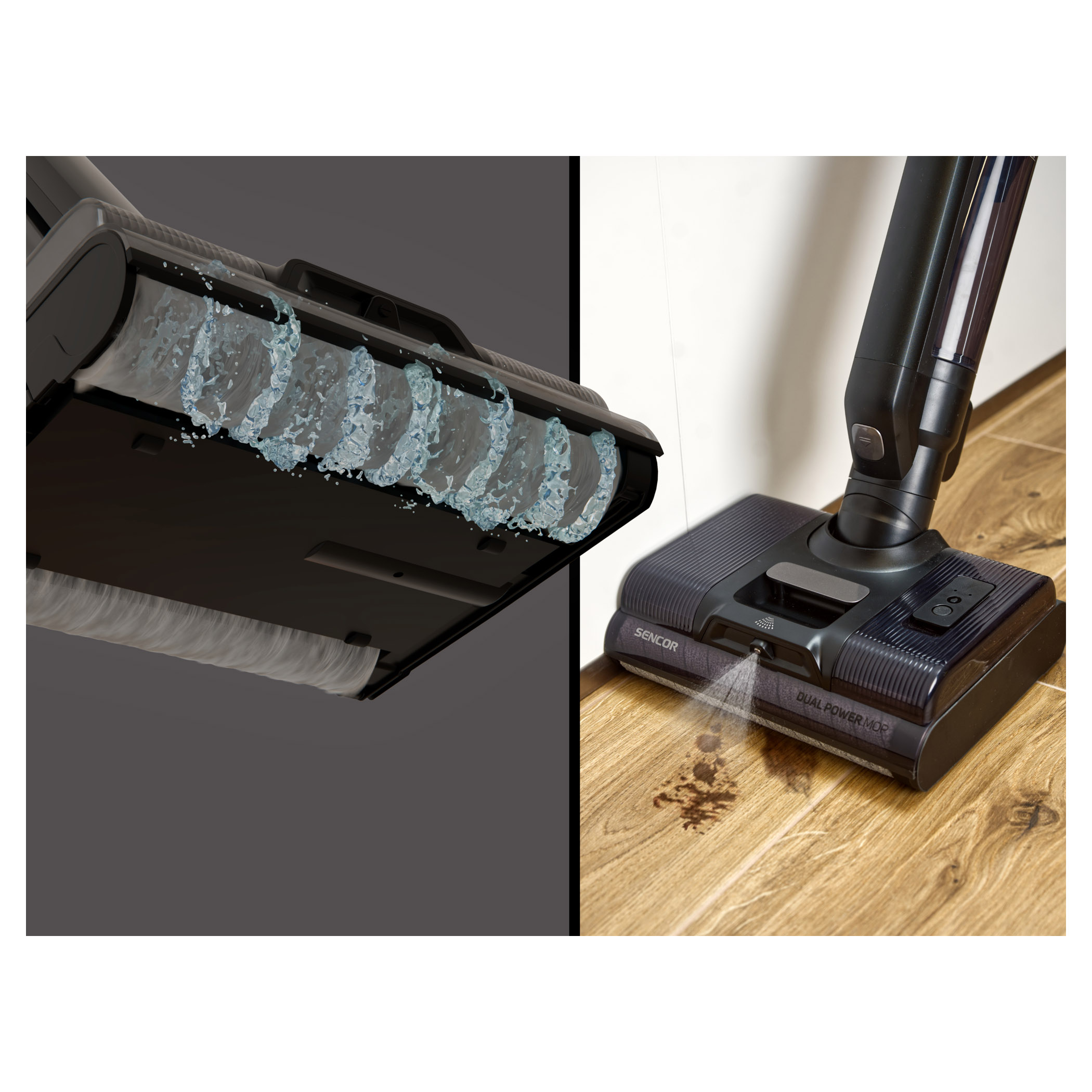 Systém Dual Power Mop s dvěma rotačními kartáči, které se otáčejí proti sobě, zvyšuje účinnost čištění a zároveň umožňuje, aby se vysavač po podlaze pohyboval téměř sám – stačí ho jen vést.Výkonný voděodolný motor